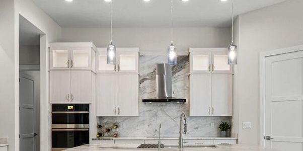 Custom Cabinet work provides this kitchen with an abundance of storage, and the back-lit glass second row of cabinets adds to the luxurious feel of this space.