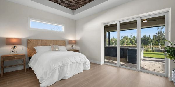 This spacious owner's suite, with custom trey ceiling with wood insert is the perfect getaway. Fully retractable sliding doors offer Florida's natural lighting and easy access to the cabana, pool and spa.