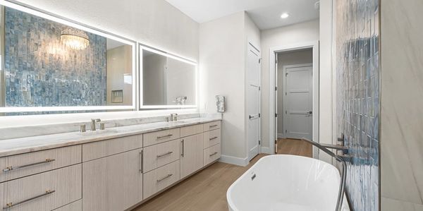 Spacious Double Vanity Sink with Dolomite type, Soaking Tub with Custom Tile Surround, give this space the feeling of being in a luxurious spa.