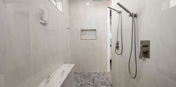 Custom Tile Shower with Bench and Niche and dual showers heads with dual controls only enhance the luxurious as you wash away all your cares.